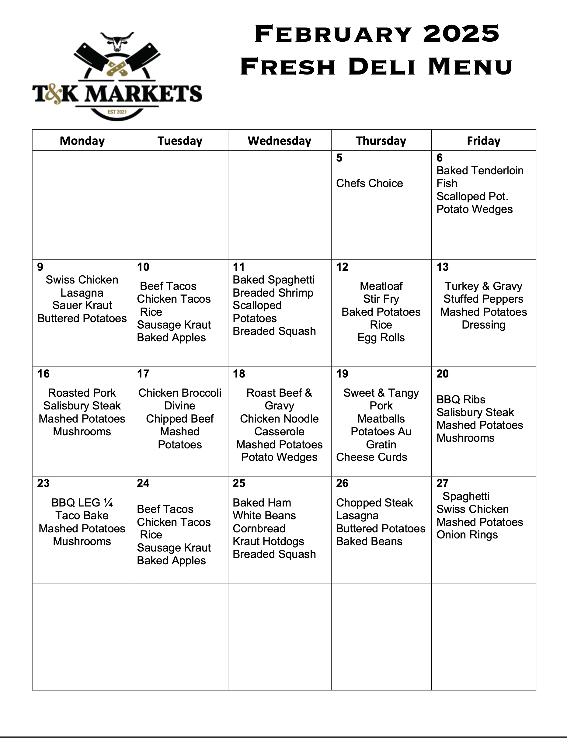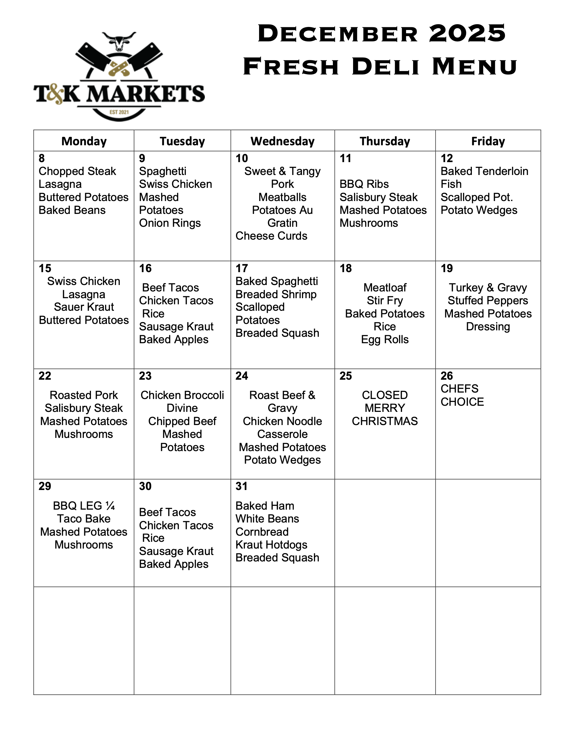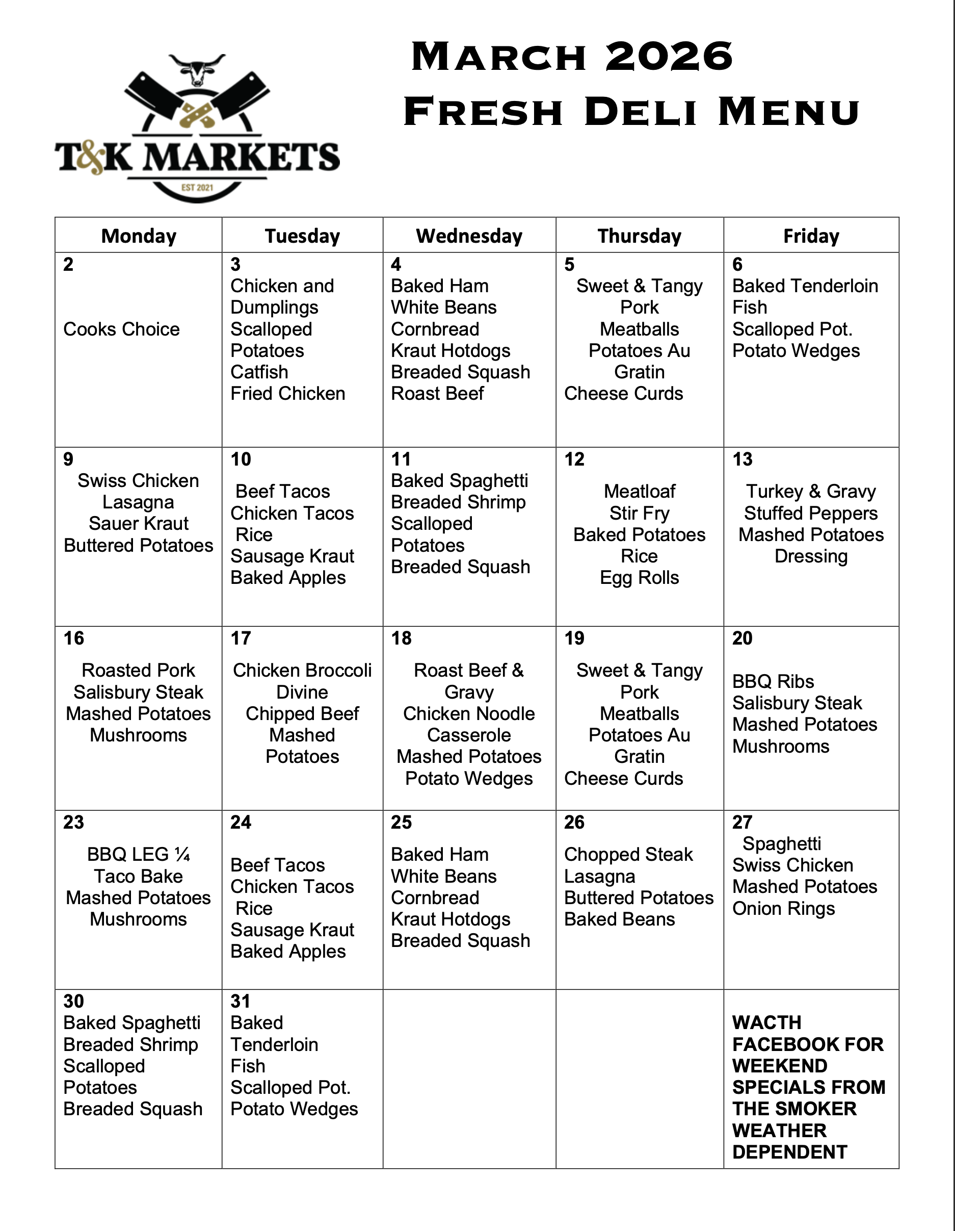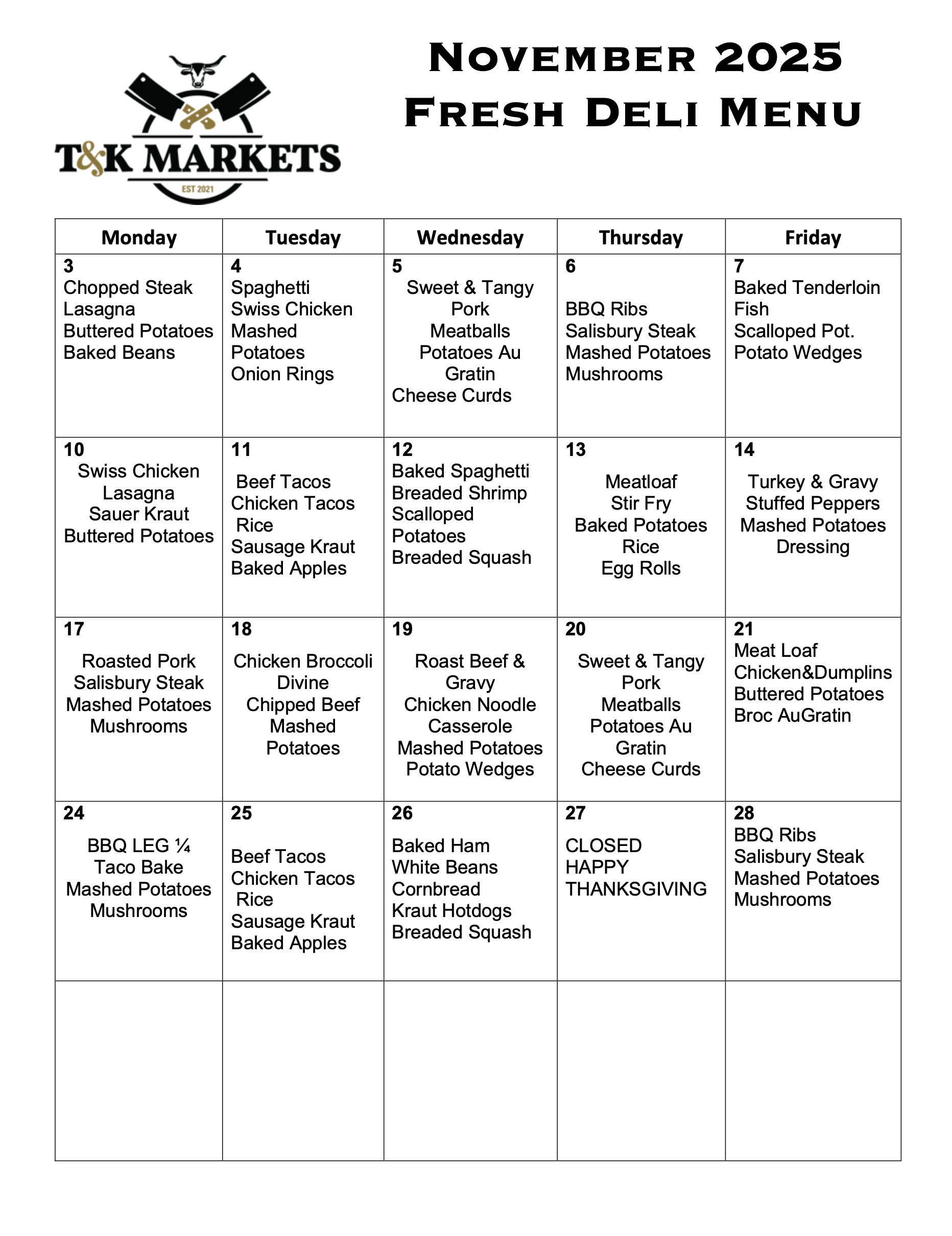 See our daily specials calendar and deli brochure for lunch, take-out, and catering options all from our local deli.